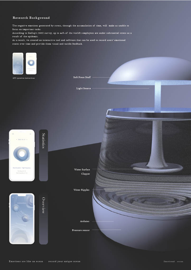 We designed a device paired with a mobile app to help workers manage negative emotions and regain focus during critical tasks. The device provides tactile and visual feedback, while the app records the intensity and frequency of presses. This allows users to review their emotional fluctuations over time and better understand their patterns when they look back in the app.
